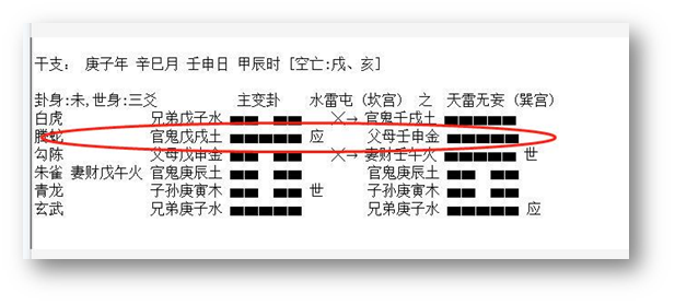 2、 应爻是对方,临鬼是心里有鬼,是有毛病的一方。临蛇是心神不安。应爻临空,应爻的财是子水,又动化回头克。克的还是应爻,说明,对方不想给钱,就在那硬挺了。这里,克者为财,所以断应爻克的子水是他的财。在五爻是路上,临蛇,我们想象一下,骑车、开车不走直线,伤了人。